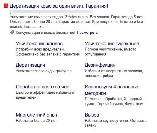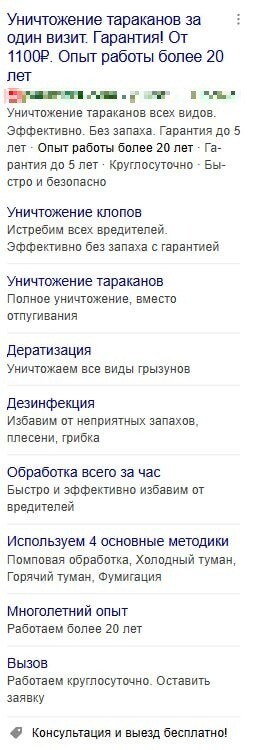 Структура рекламных кампаний была соблюдена следующим образом: группа запросов (пример “уничтожение клопов”) - посадочная страница на “уничтожение клопов” - заголовки и текста объявлений на “уничтожение клопов”