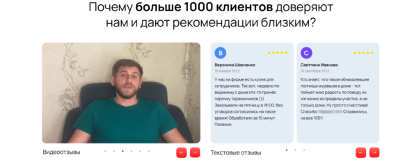 - Оформили реальные отзывы, включая видео, а также рейтинг с Яндекс.Карт;