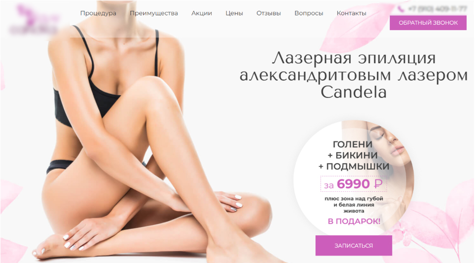Вот пример хорошего УТП. Предложение содержит конкретную информацию: указан тип лазера («александритовый лазер Candela») и зоны эпиляции (голени + бикини + подмышки, прописана стоимость 6990 ₽. Есть дополнительный бонус в виде эпиляции зоны над губой и белой линии живота в подарок.