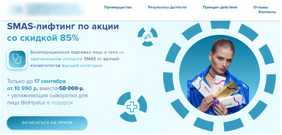 Страница, которая сразу показывает услугу (SMAS-лифтинг), выгоду (скидка 85%) и конкретные условия (цена, срок действия, подарок). Это позволяет быстро привлечь внимание и получить заявку.