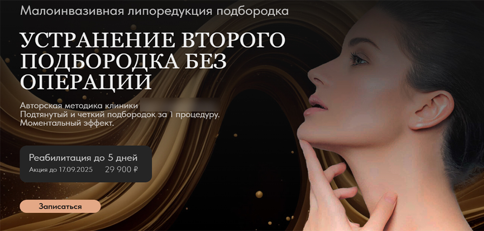 Страница, которая фокусируется на решении конкретной проблемы (устранение второго подбородка без операции). В заголовке сразу есть ответ на запрос клиента, а в описании — подробности о методике и цене.