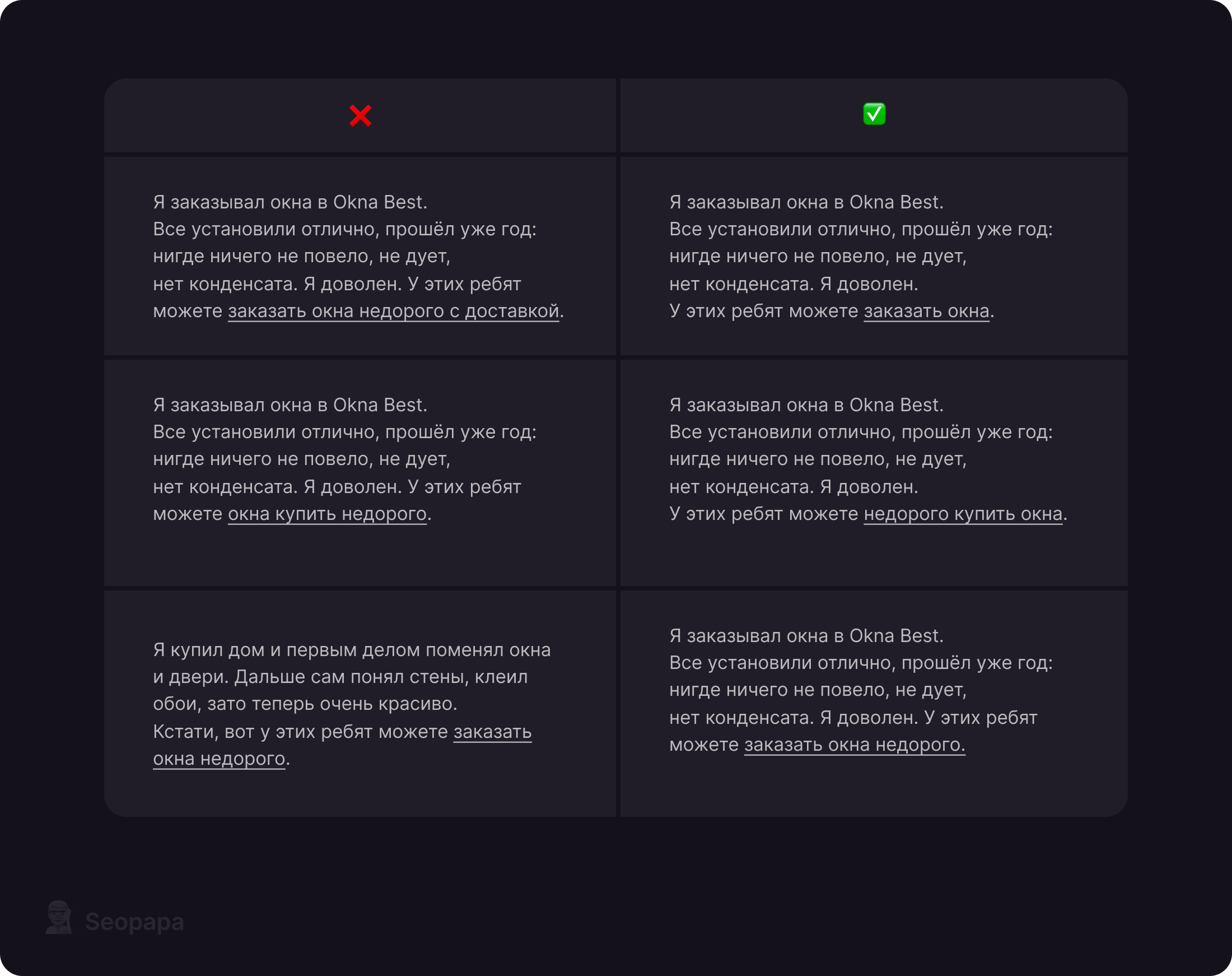 Для каждой площадки нужен уникальный текст. Истории должны отличаться, быть живыми и детализированными. Чем больше конкретики, тем естественнее выглядит ссылка.
