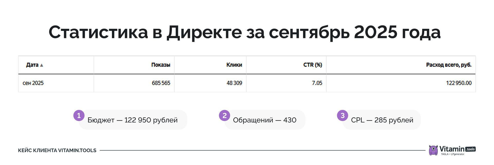 Когда работа над лендингом завершилась, наступил этап запуска трафика. Бюджет в 120 000 ₽ — сумма для небольшой клиники серьезная, и нам как агентству важно было распорядиться ею максимально эффективно. Мы решили завести проект в Vitamin.tools — рекламную экосистему, возвращающую до 18% от пополнения рекламы — и вот что это дало: