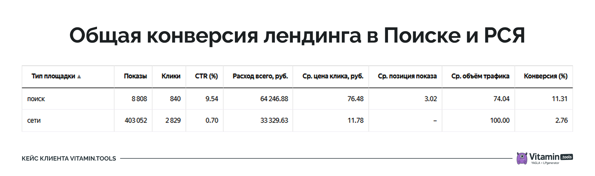 Лендинг лучше конвертил в Поиске, но в РСЯ получали больше обращений при меньшем бюджете