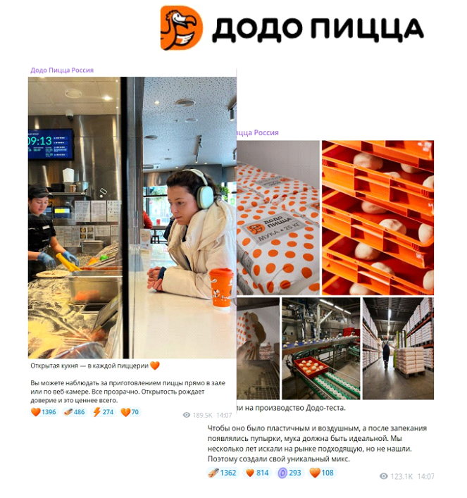 Пример: Dodo Pizza всегда были открытой компанией и превратили прозрачность в главный источник доверия. Они честно показывают, как устроен бизнес: в их кухнях установлены онлайн-камеры, в их каналах выходят подробные кейсы, объясняющие видео и открытые разборы ошибок.
