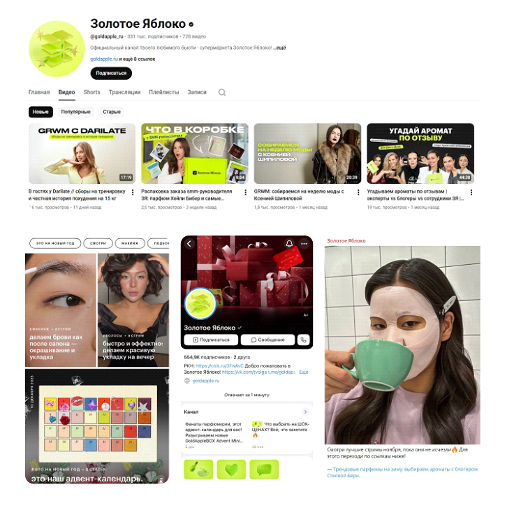 Пример: “Золотое яблоко” разработали стратегию: быть с клиентом на разных платформах, но с разными задачами и форматами, чтобы постоянно оставаться в поле внимания и возвращать трафик в свою экосистему. Они используют сайт и приложение, YouTube, ВК, Telegram, при этом разделяют роли каналов: видео для охвата, Telegram для новостей и дропов, приложение для покупки.