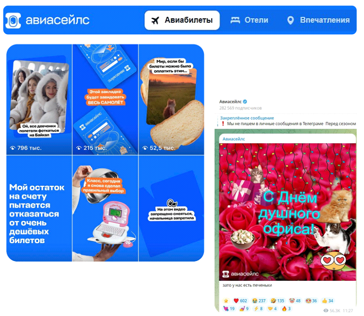 Пример: Aviasales всегда славились провокационными ироничными постами и мгновенной реакцией на новости и события. Уже много лет их стратегия остается неизменной: они быстро забирают внимание пользователя с помощью трендов и переводят его в покупку.
