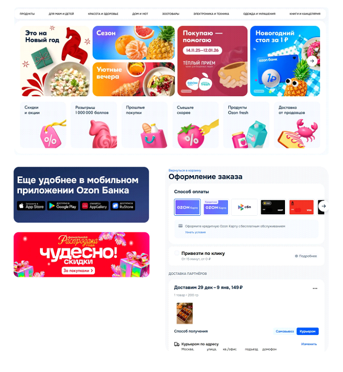 Пример: Ozon и Ozon Fresh настоящие гуру в этом деле. Они ввели упрощенный checkout в 1–2 клика и быструю оплату через Ozon-счет, сохраненную карту и СБП, чтобы не терять клиента перед покупкой.