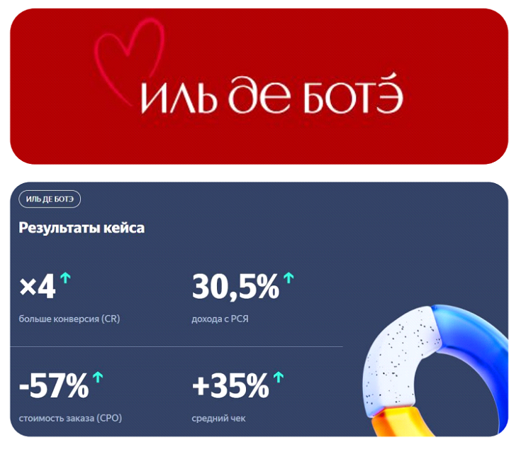 Пример: ИЛЬ ДЕ БОТЭ через РСЯ показывают персональные офферы тем, кто уже готов покупать, и людям, похожим на них. Используют для этого инструменты сегменты Яндекс.Метрики, Яндекс.Аудитории, ретаргетинг и look-alike, персонализированные креативы.