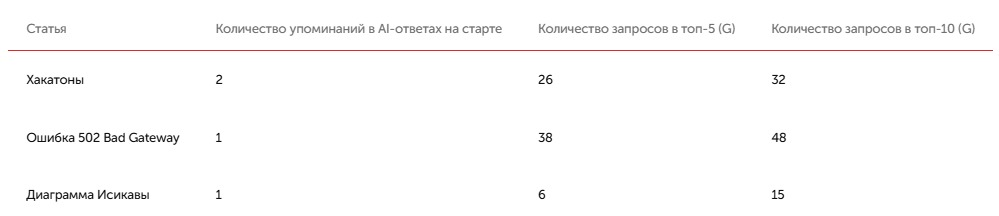 Подготовительный этап стартовал в августе–сентябре 2025 года. Мы выбрали 3 публикации блога, которые занимают устойчивые позиции в органическом поиске, но при этом практически не видны в ИИ-ответах: лонгрид о хакатонах, технический материал об ошибке 502 Bad Gateway и практическое руководство по построению диаграммы Исикавы.