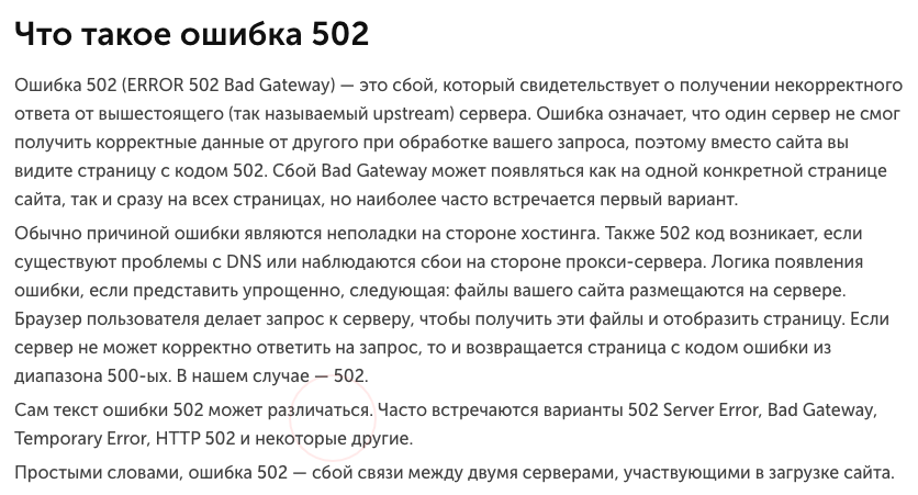 В материале, посвященном ошибке 502, прямо в первом абзаце приводится четкое определение сбоя с указанием его первопричины.
