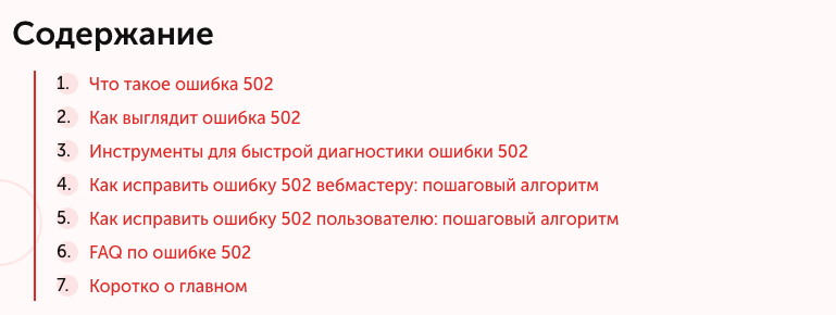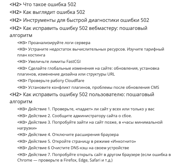 В материале об ошибке 502 заголовки выстроены по четкому алгоритму: открывает раздел блок диагностических инструментов («Средства оперативной диагностики ошибки 502»), затем следуют инструкции для вебмастера — анализ логов и мониторинг серверных ресурсов. И лишь после этого представлены рекомендации для конечных пользователей с детализированными шагами: верификация доступности ресурса, уведомление администратора, ожидание стабилизации нагрузки, деактивация расширений и пр.