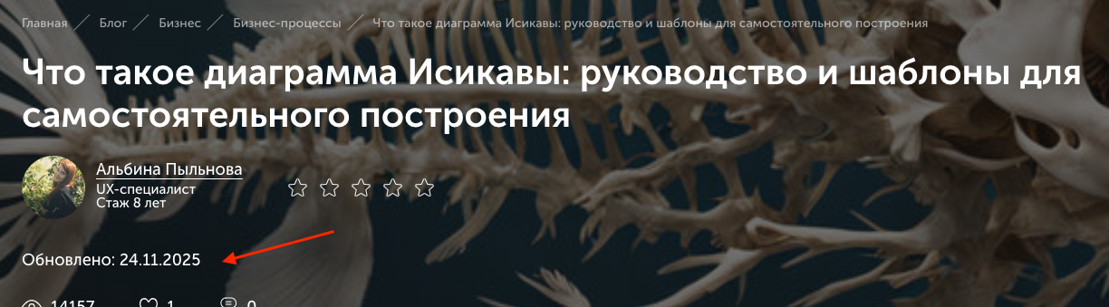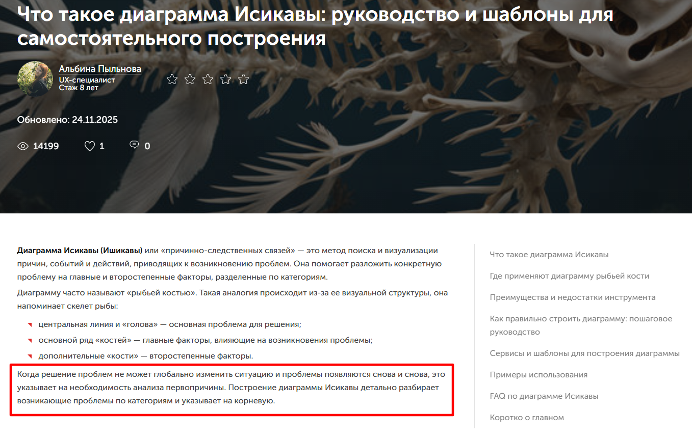 Материал про диаграмму Исикавы первоначально находился в полной «тени» для ИИ — было зафиксировано лишь разовое цитирование. После изменения архитектуры текста и актуализации данных частота упоминаний выросла до стабильных 3–4.