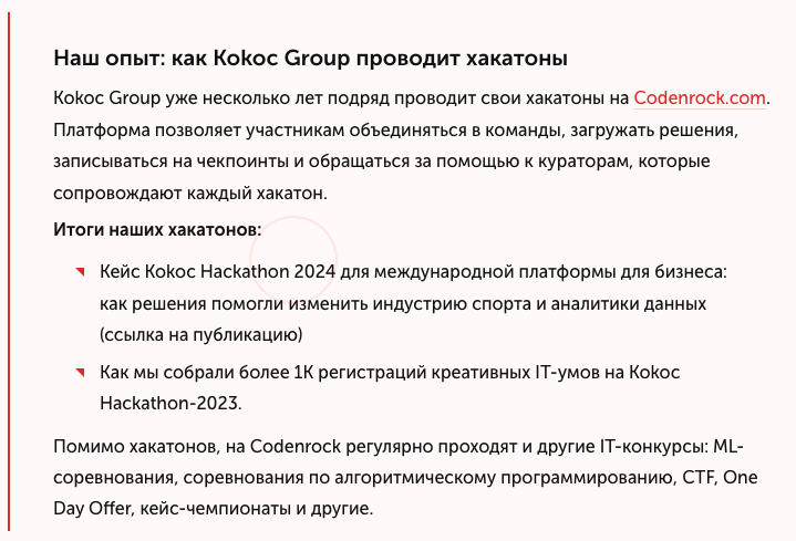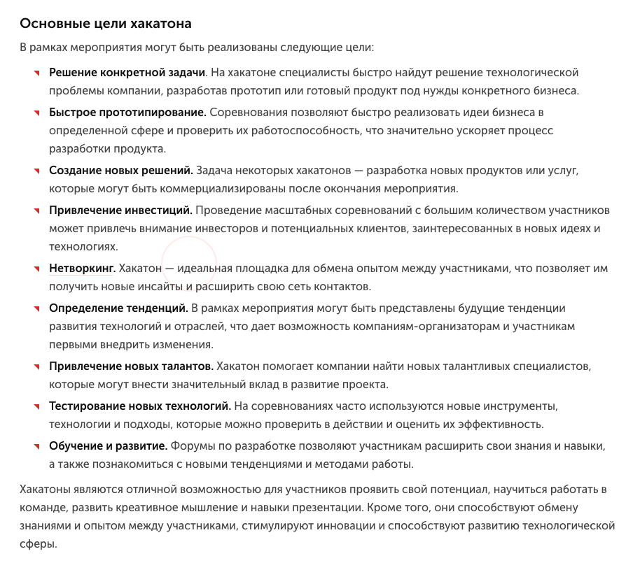 Так, в публикации о хакатонах задачи мероприятия представлены в виде маркированного перечня. Такой формат идеален для цитирования, поскольку напрямую отвечает на потенциальные запросы:
