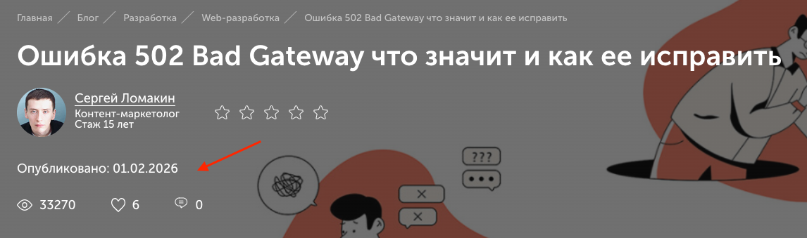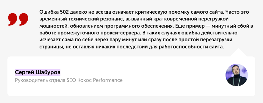 Так, в материале об ошибке 502 появился экспертный блок с комментарием руководителя SEO-департамента Сергея Шабурова, его фотографией и указанием должности.
