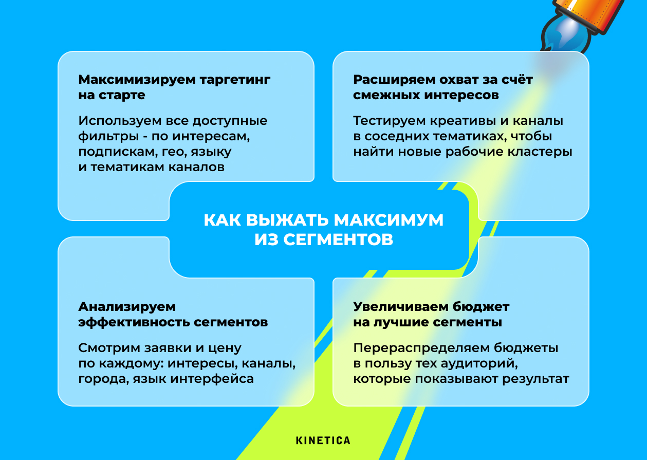 Наша рабочая логика выглядит так: на старте используем все доступные фильтры, которые могут приблизить нас к целевой аудитории: интересы, тематики каналов, язык интерфейса, географию. Это про сбор чистых данных — чтобы сразу отсечь очевидно нерелевантный трафик.