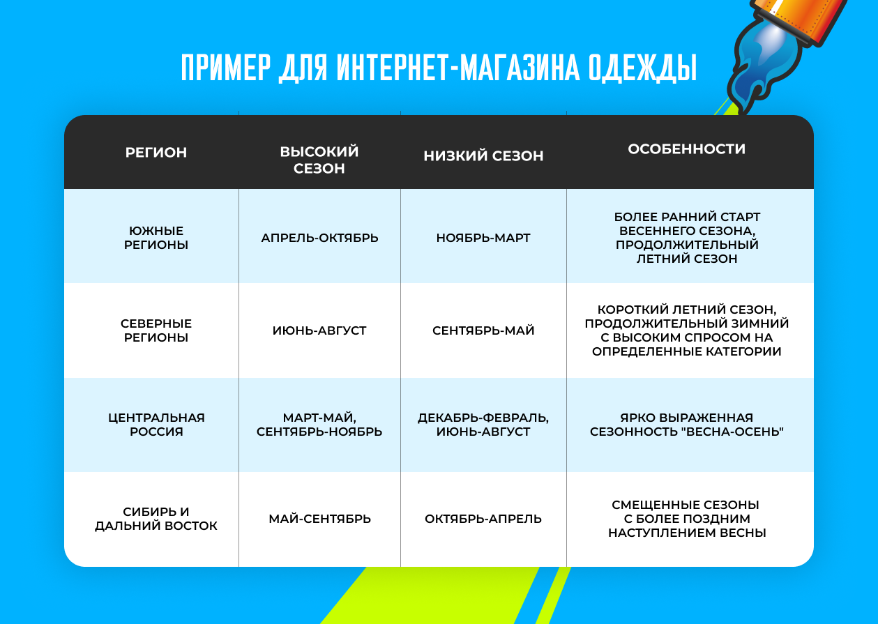 Кстати, это один из самых недооценённых факторов в мультирегиональных проектах. Компании запускают «осенние» кампании в сентябре для всех регионов одновременно, хотя в южных регионах сезон ещё не начался, а в сибирских — уже заканчивается.
