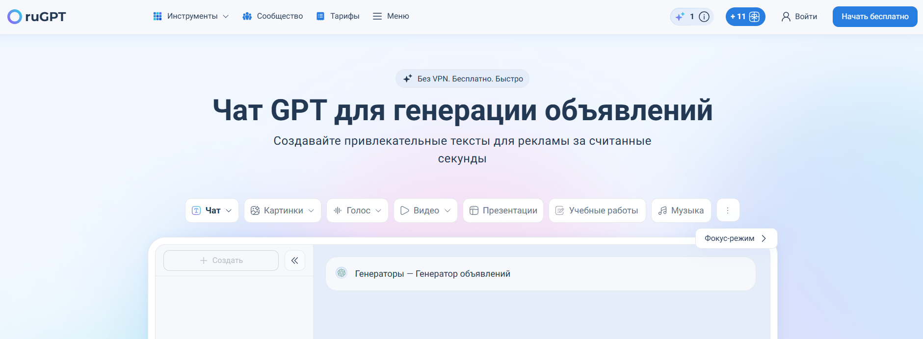 - Дополнительные функции: генерация текста для рекламы в разных стилях и форматах