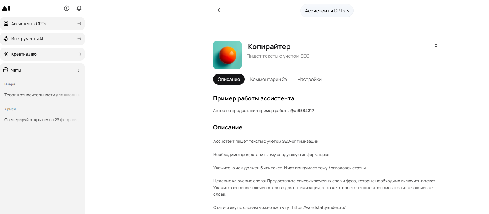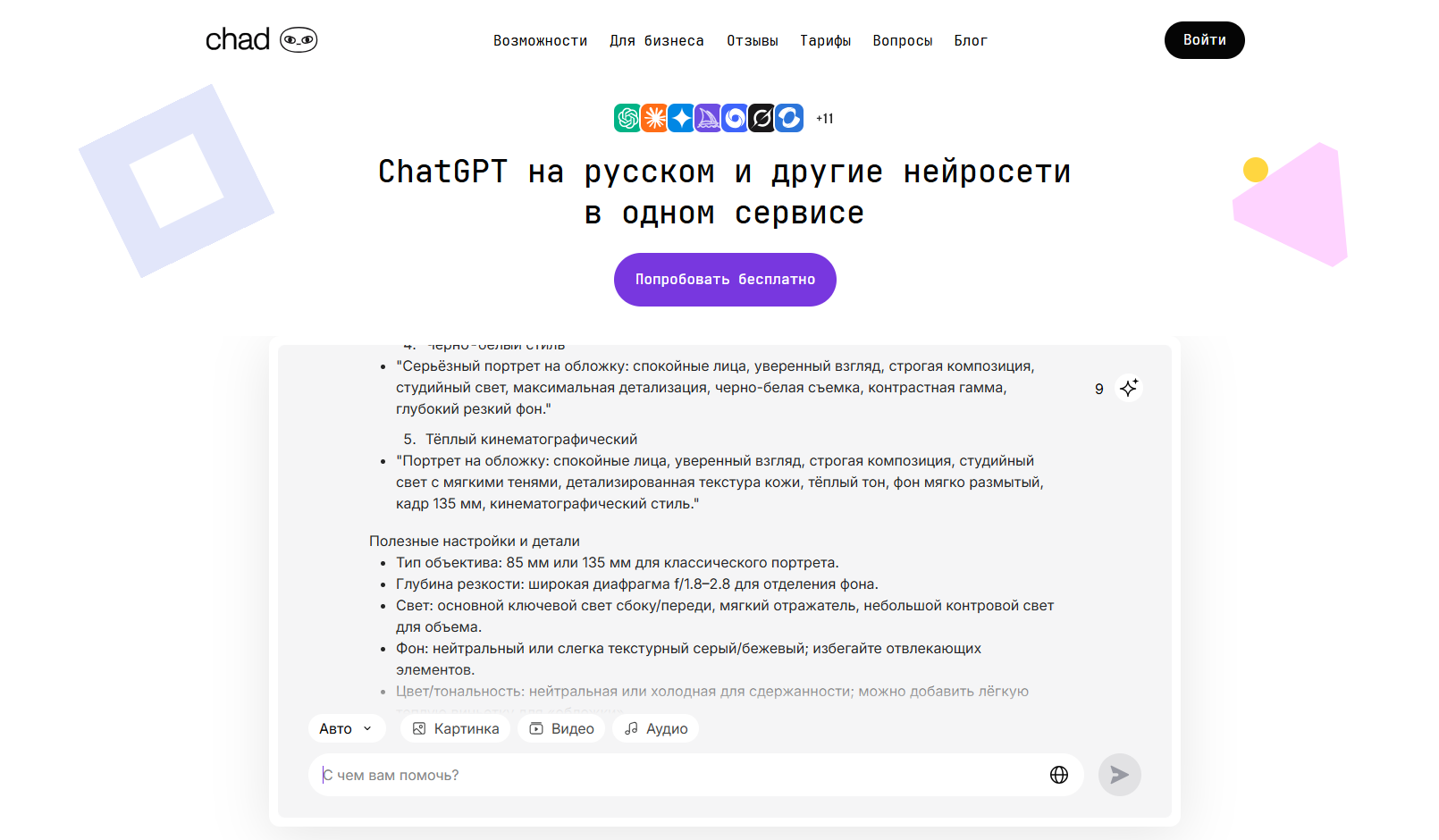 - Дополнительные функции: генерация текста любого формата (объявления, посты, описания), адаптация под тональность и целевую аудиторию, возможность работать в чате с уточняющими запросами, помощь в создании идей и заголовков