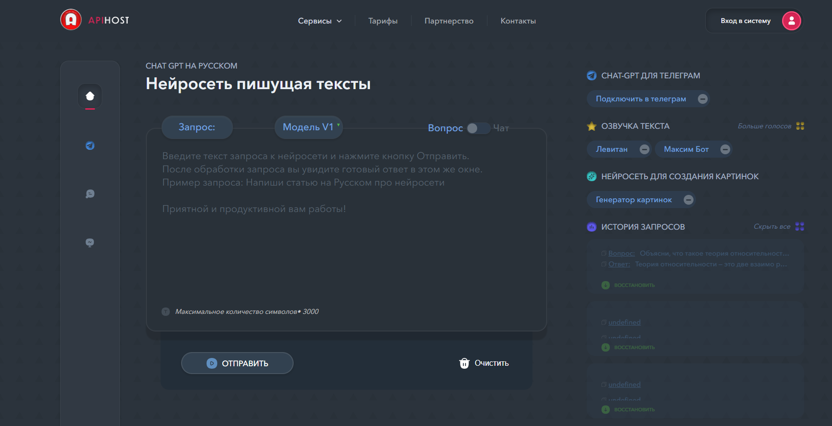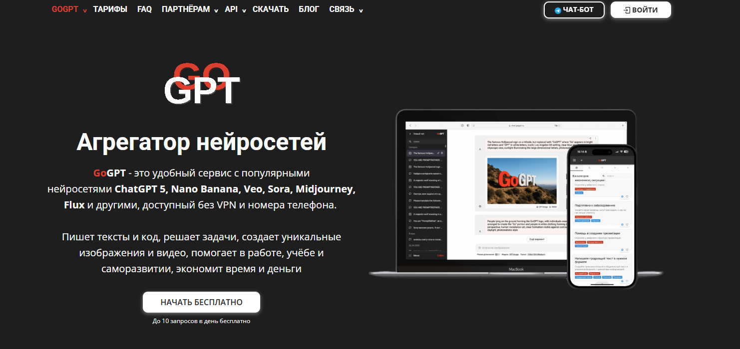 - Дополнительные функции: генерация текста любых форматов (ответы, описания, объявления), озвучка текста, поддержка различных моделей GPT, можно работать через Telegram‑бота и API
