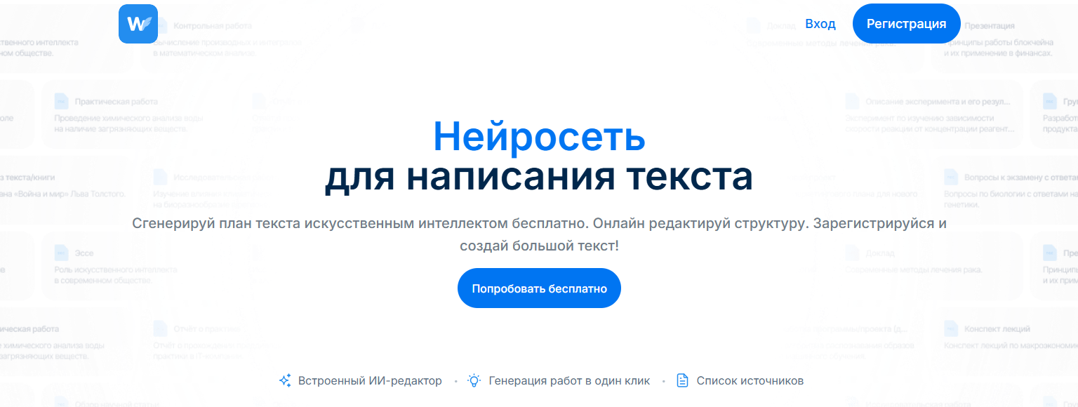 - Дополнительные функции: генерация текста любого объема — от коротких текстов до больших работ, планирование структуры текста, встроенный ИИ‑редактор, адаптация под тему и стиль текста