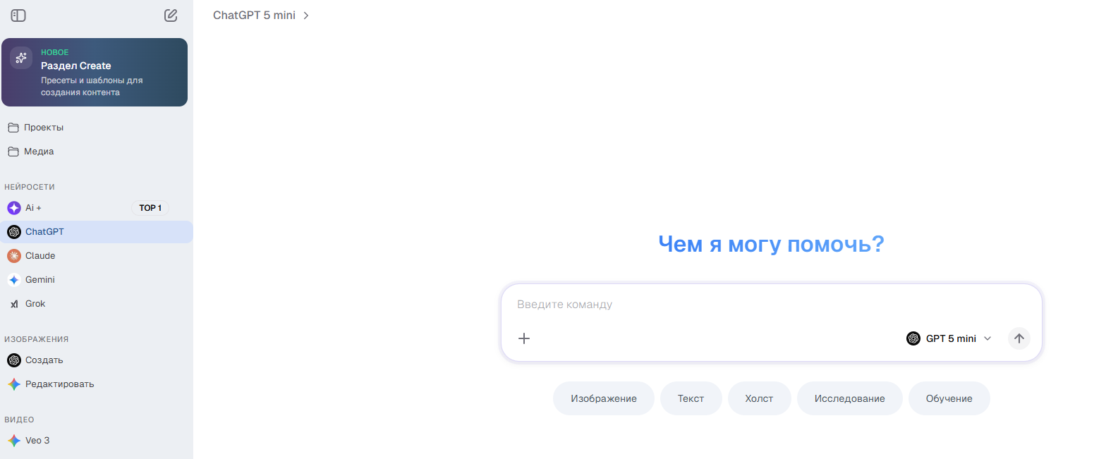 - Можно выбрать модель ИИ под задачу (GPT‑5, mini и т.д.).