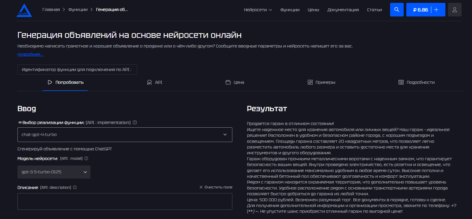 - Тарифы: оплата по API, вы платите за объявление с помощью ИИ