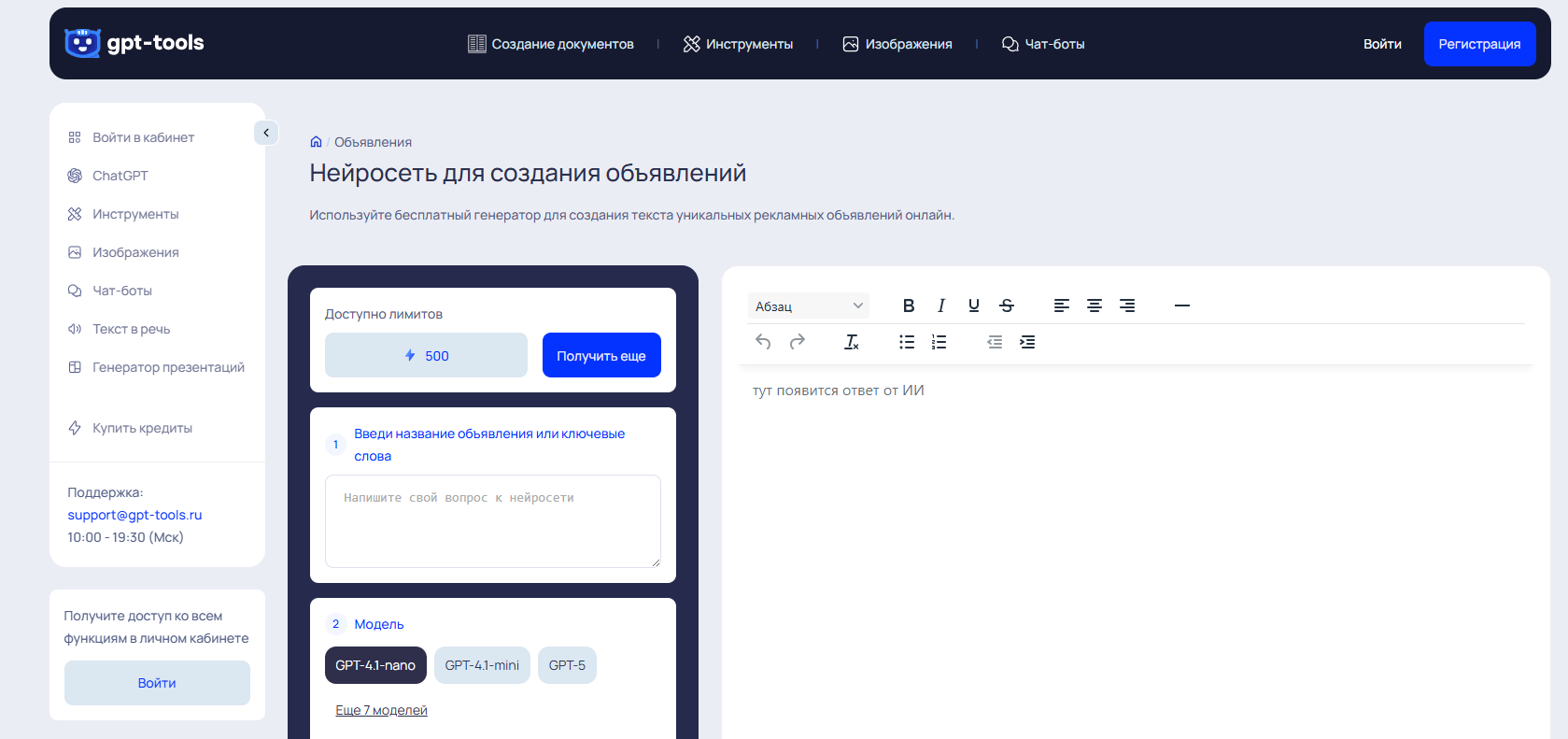 - Тарифы: нейросеть для создания объявления бесплатно (лимит 500 символов/кредитов), можно получить еще кредиты после регистрации