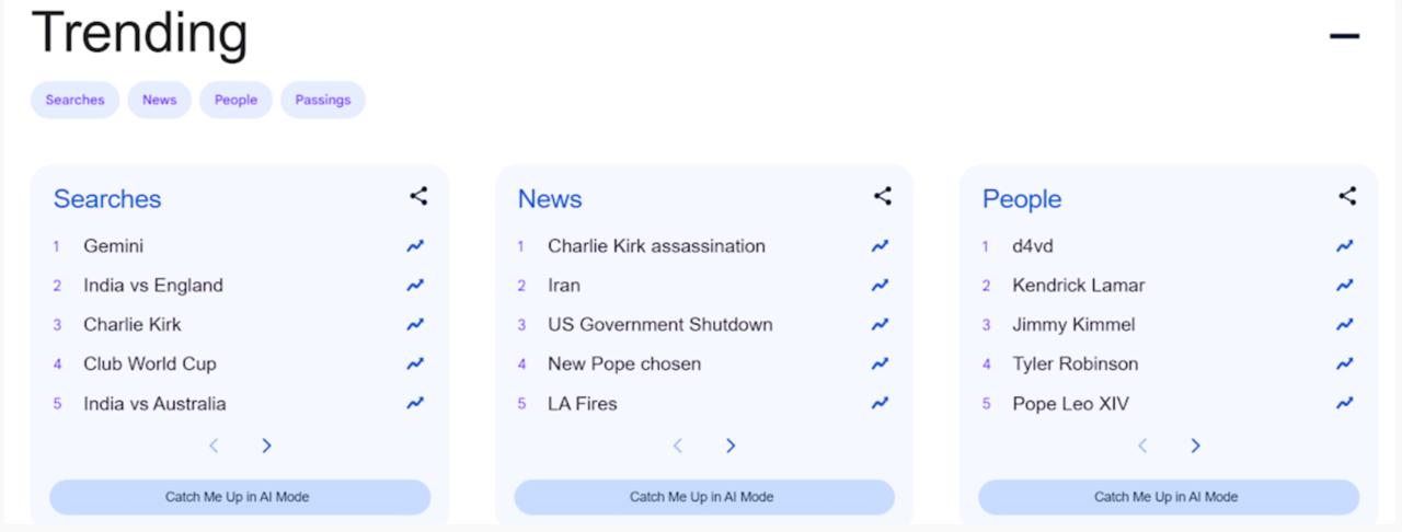 В категории «Новости» пользователи чаще всего искали информацию об убийстве Чарли Кирка, Ирано-Израильской войне, приостановке работы правительства США, выборах нового папы Римского и лесных пожарах в Лос-Анджелесе.