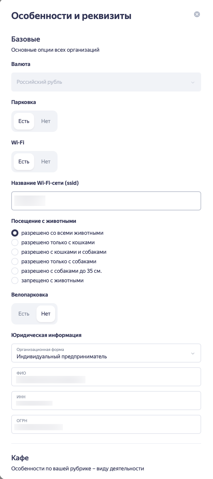 В этом разделе указываются характеристики, которые помогают пользователям выбрать именно вас.Например, для кафе можно отметить: