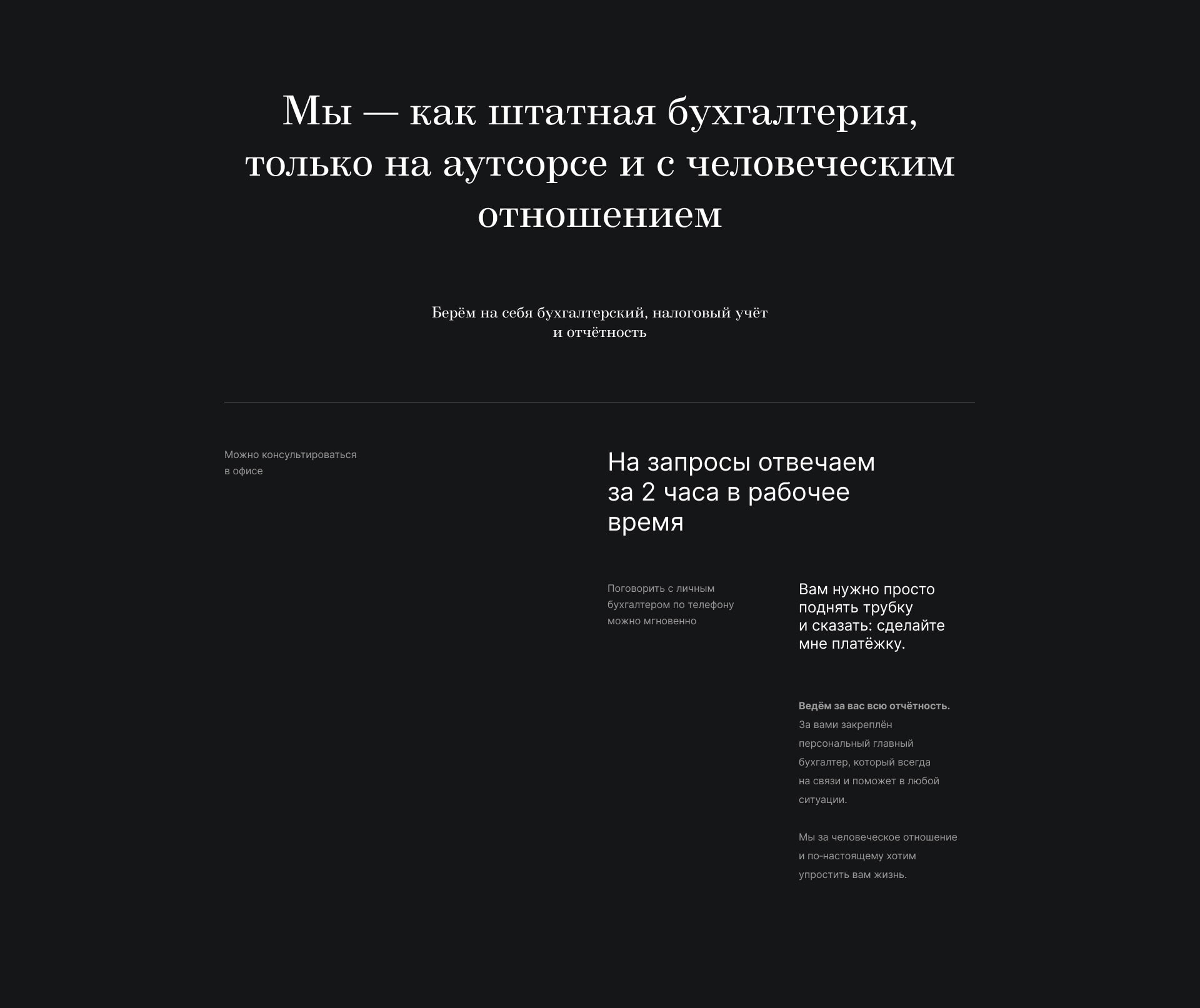 Проблема большинства бухгалтерских сайтов — это шаблоны из 2000-х и тексты. Они пишут сложным техническим языком про сложные бухгалтерские вещи для конкурентов, потому что им стыдно писать простым языком, ведь засмеют. В результате клиенты ничего не понимают и уходят.