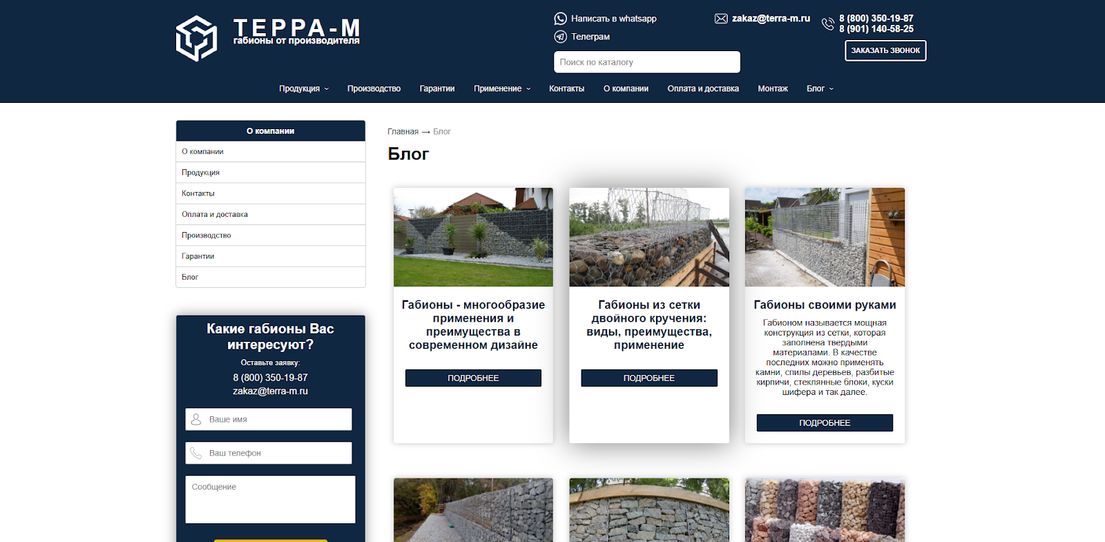 Следующий сайт из присланных в чат Прожарки Сергей Шабуров выбрал сам — им оказался ресурс производителя габионов ТЕРРА-М (terra-m.ru).