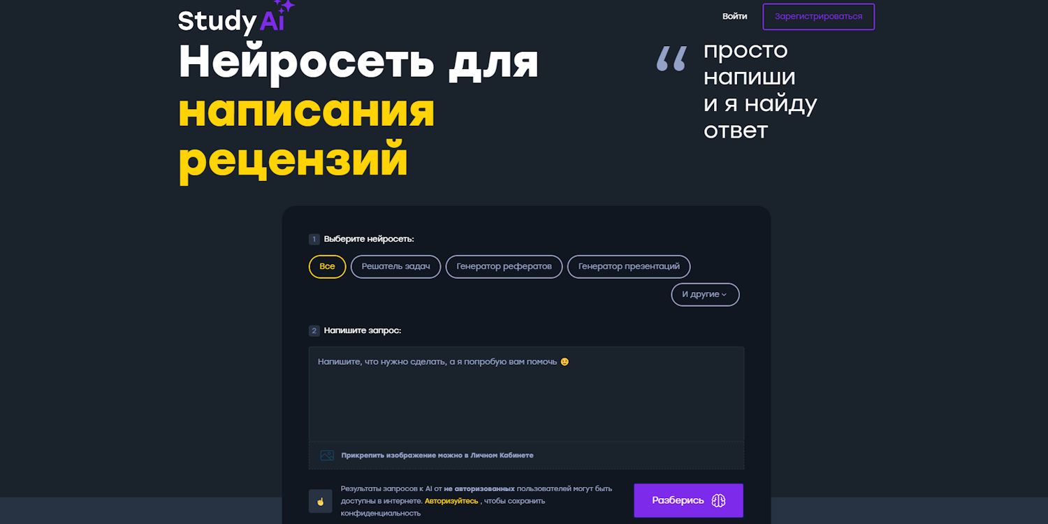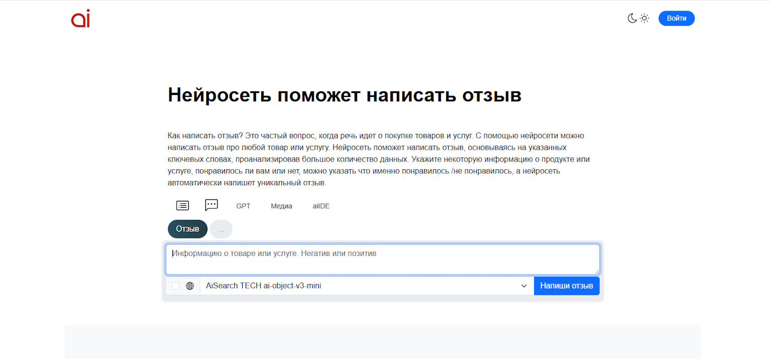Многофункциональный онлайн‑инструмент с нейросетями, который умеет генерировать тексты практически на любую тему, включая отзывы о товарах и услугах. В разделе «Нейросеть поможет написать отзыв» можно описать продукт, указать свои впечатления (что понравилось/не понравилось), а ИИ автоматически соберет содержательный текст на основе вашего ввода и анализа данных. Я пробовал писать через него отзывы — достаточно четко описал продукт и ожидания, и нейросеть выдала текст, который уже можно использовать как основу (хотя иногда требует легкой правки).