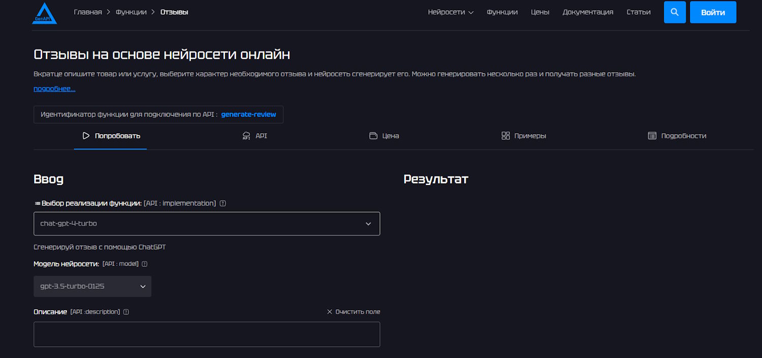 Универсальная платформа, которая предоставляет доступ к мощным нейросетям через API, и среди ее функций есть специальная генерация отзывов. Суть очень простая: вы кратко описываете товар или услугу и указываете, какой тип отзыва хотите получить — положительный, нейтральный или негативный, а ИИ отдает вам готовый текст. Я пробовал эту функцию лично, и впечатляет, насколько разные варианты отзывов можно получить за пару секунд просто на основе вашего описания — не нужно ничего придумывать самому. Это удобно как для разработчиков, так и для тех, кто хочет автоматически создавать тексты для сайтов или проектов с отзывами.