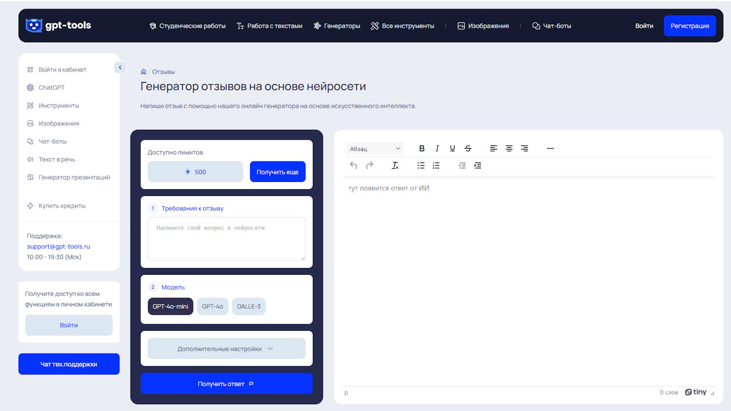 Удобный сервис для генерации различных типов текстов, включая отзывы и рецензии, с использованием нейросетевых технологий. Особенность этого инструмента в том, что можно работать с несколькими моделями ИИ, такими как ChatGPT, Claude, Gemini и другие, прямо в одном месте. Мне лично понравилось, что сервис позволяет гибко настраивать тексты под различные задачи и форматы, будь то отзыв, рецензия или даже презентация. Простота и доступность интерфейса, а также разнообразие функций делают его удобным для быстрого создания качественного контента.