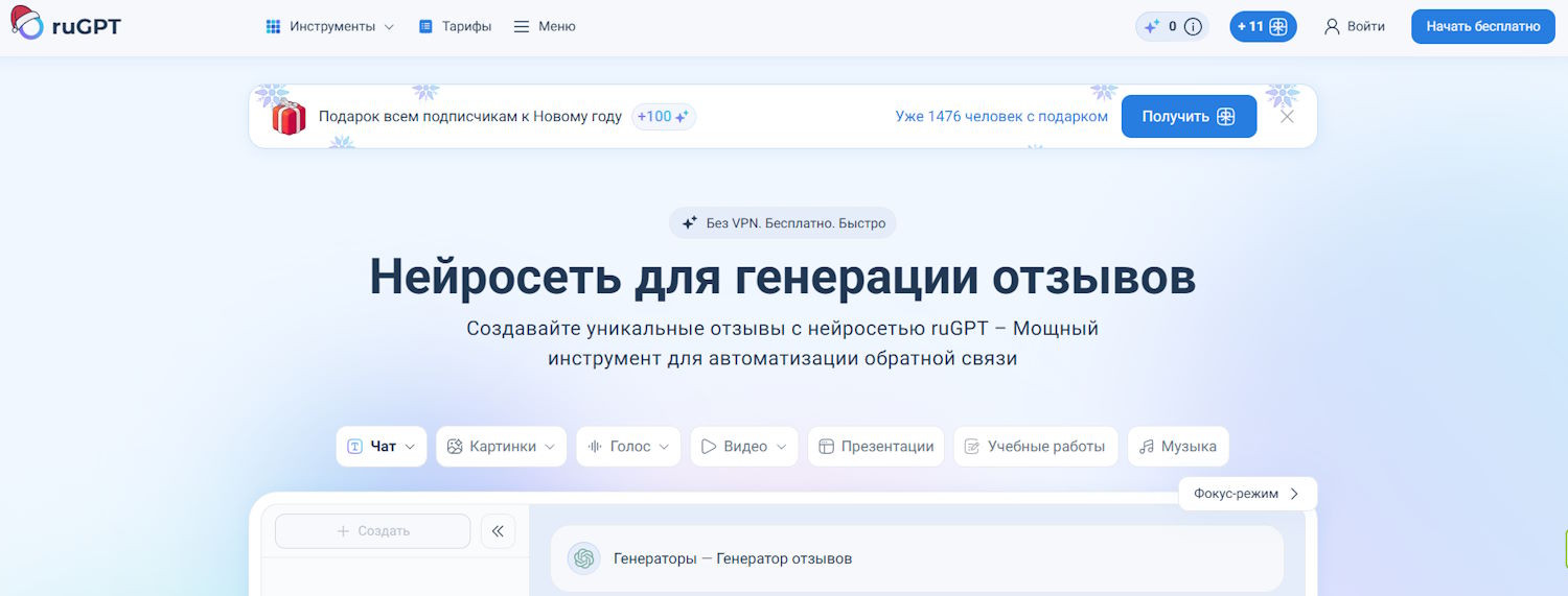 - Типы поддерживаемых форматов: текстовые отзывы, рецензии, краткие и длинные описания, генерация изображений, кода, видео