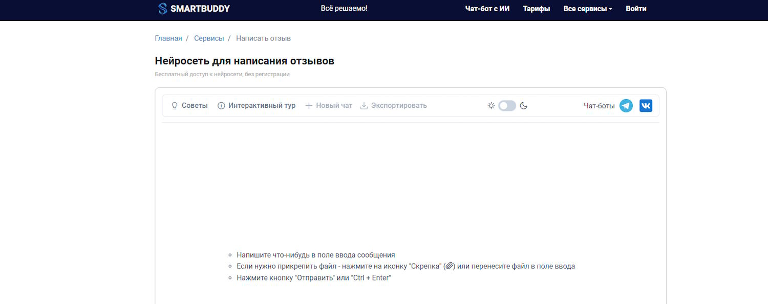 Онлайн‑чат с мощной языковой моделью, которая умеет писать связные тексты на русском языке по вашему описанию и запросам. Сервис поддерживает настройку эмоционального тона — можно попросить сделать отзыв позитивным, нейтральным или даже критичным, что удобно, если вы хотите разные варианты под разные задачи. Я пробовал его в деле — достаточно четко прописал продукт и требования, и ИИ выдал отзыв, который можно было почти не править под публикацию.