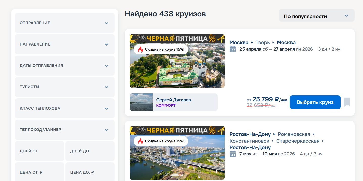 - Также нет возможности найти круиз по названию направления. А если пользователь не очень ориентируется в российских городах и реках? В этом случае ему будет сложно разобраться в маршрутах.