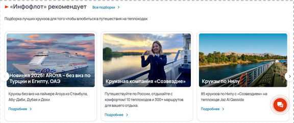 - На главной странице нет блока с горящими или выгодными предложениями, есть только блок «Инфофлот рекомендует», но его нельзя считать аналогом. Из превью-карточек нельзя понять, какие ближайшие даты, какая стоимость, выгода и прочее.