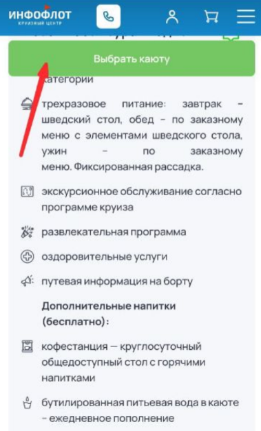 В версии сайта для смартфонов на страницах карточках туров кнопка «Выбрать каюту» закреплена под шапкой. Подобное расположение совершенно непривычно: на большинстве сайтов конверсионные элементы закрепляются в нижней части экрана.