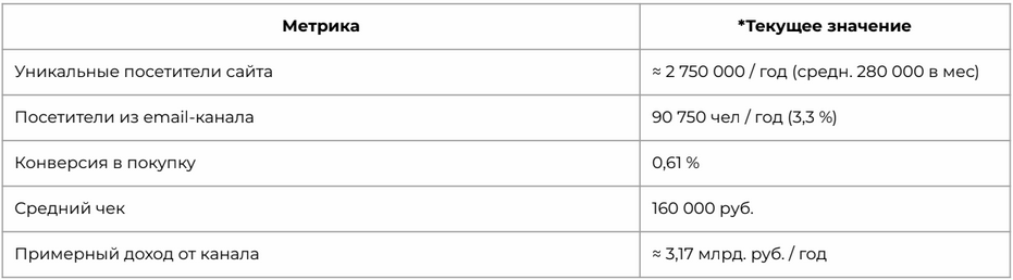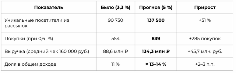 Даже без роста конверсии, только за счет увеличения охвата email-канала до 5 % CRM-выручка вырастет на 45–50 млн руб./год!