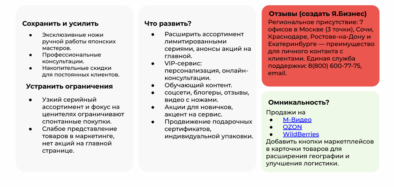 Вывод очевиден: нужно срочно перенимать проверенные решения! А конкретно — добавить блоки с популярными товарами, расширить характеристики в карточках, внедрить оплату в рассрочку или кредит, показать карту офлайн-точек продаж. И обязательно расширить структуру сайта, добавив разделы по брендам, количеству и типам ножей, типам нарезки и ценам, чтобы охватить больше запросов.