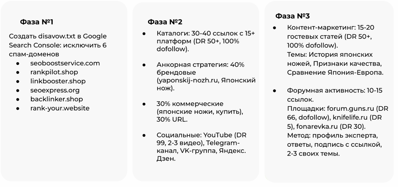 Это огромная работа, и ее нужно выстраивать поэтапно. Сначала отказаться от существующих некачественных ссылок. Затем заявить о себе: прописаться в авторитетных каталогах, начать вести соцсети. После этого активно привлекать внимание: писать гостевые посты в кулинарных блогах, отвечать на форумах. В идеале — создать собственный интересный контент, который захотят рекомендовать другие.