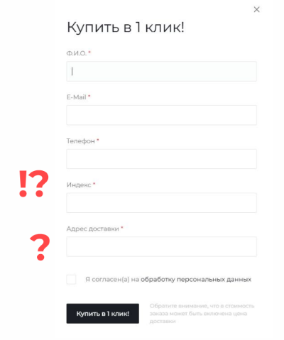 Процесс заказа тоже усложнен. Форма «Купить в 1 клик» требует заполнения пяти полей, что противоречит самой идее быстрой покупки.