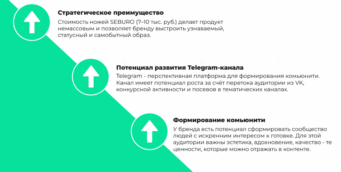 Чтобы достичь результатов, карина посоветовала определить ключевые сегменты ЦА, сформировать единый визуальный гайд, разработать четкую контент-стратегию и делать ставку на качественный оригинальный контент: видео с шеф-поварами, экспертные статьи, красивые рецепты. Конечно же, нужно активно развивать Telegram, привлекая туда аудиторию из ВК.