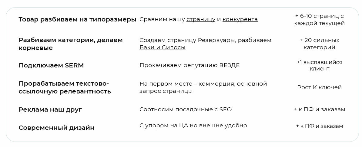 Предложили поменять УТП — раньше клиент обозначал его как «Низкие цены, т.к. напрямую закупаем сырье у производителя». Но многие конкуренты являются и поставщиками, и производителями в одном лице. Необходимо проработать более качественный УТП. Например, “Всегда в наличии на складе — оперативная отгрузка за 2 часа после обращения” или “Поставка редких позиций под заказ”.