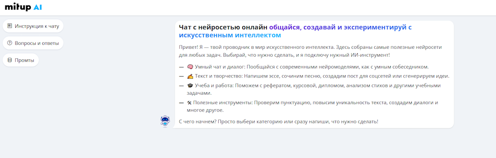 Многофункциональная русскоязычная платформа на основе искусственного интеллекта, которая поддерживает генерацию, редактирование и форматирование текстов, включая коммерческие предложения, письма, SEO‑контент и другое. Интерфейс работает онлайн и позволяет вводить данные, выбирать стиль и получать результат практически сразу. Он рассчитан не только на маркетологов и копирайтеров, но и на команды, которым нужен быстрый текстовый вывод без сложной подготовки.