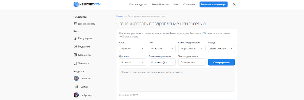 - Наличие пробной версии: для неавторизованных пользователей предоставляется до 3 генераций в сутки
