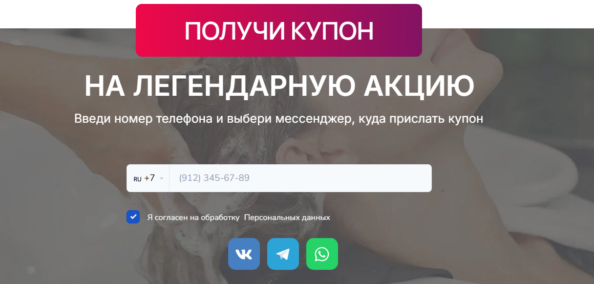 Создали лендинг на Tilda для входа в автоворонку с кнопкой призыва к действию (CTA) – «Получить купон» через мессенджеры Telegram, WhatsApp, ВК.