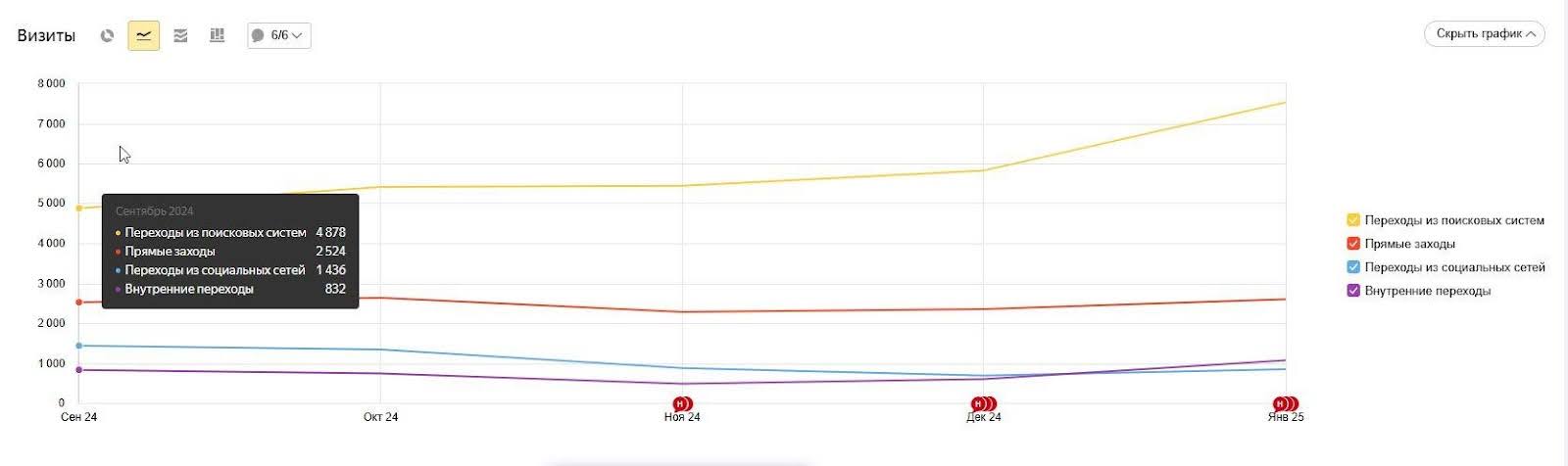 Решающую роль в объеме трафика сыграло локальное SEO (Яндекс.Бизнес) и ликвидация технических ошибок. Это основа, без которой даже самый лучший контент не будет работать.